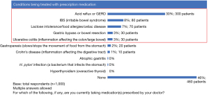 Consistent with the initial CONTROL Surveillance Study, the prevalence of comorbid diseases or conditions, some of which could adversely affect the absorption of levothyroxine, was observed (18). Among study participants, 54% reported having GI comorbidities (Figure 2). Participants with GI comorbidities were more likely to report changes in levothyroxine dosing than those without such conditions (74% vs. 48%, P<0.05). These comorbidities were generally consistent with prevalence rates reported in the medical literature for the population at large (7,13,16-18) and included GERD/acid reflux (30%), IBS (8%), lactose intolerance, food allergies/sensitivities and celiac disease (7%), ulcerative colitis (3%), gastric bypass or bowel resection (3%), gastroparesis (2%) or Crohn’s disease (1%) (Figure 2). Results of the study did not specify who of the 3% selected gastric bypass or bowel resection. Ulcerative colitis is representative of inflammatory bowel disease, affecting the large bowel. Some data have shown that the associated inflammation may decrease levothyroxine absorption by increasing small intestinal permeability (19).